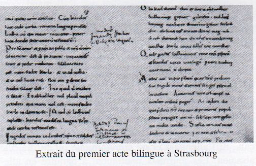 Depuis le Haut Moyen Âge, le latin était la langue culturelle des clercs et des nobles. Mais voici que, le 14 février 842, dans le célèbre Serment de Strasbourg, apparaît en Alsace le premier acte bilingue, écrit à la fois en langue romane (français) et en langue tudesque (futur Hochdeutsch). A partir du XVe siècle, on trouve même des écrits en langue alsacienne.