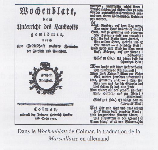 La Révolution de 1789 fait souffler un autre vent. Monet, maire de Strasbourg, originaire de Savoie et adversaire déclaré de tout particularisme alsacien, se propose même de déporter dans d'autres provinces ceux "qui ne connaissent pas la langue française et que leur idiome isole du reste de la République". Saint-Just, chef révolutionnaire jacobin, demande aux Alsaciens "de quitter les modes allemandes puisque leurs cœurs sont français" et lance un vaste projet de francisation. Après la suppression des maîtres d'école, les instituteurs de la République sont chargés d'apprendre aux enfants la langue française.