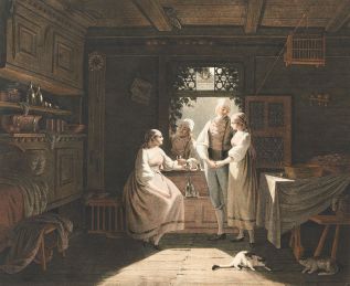 Après la signature du contrat de mariage viennent les réjouissances auxquelles sont invités, non seulement les deux familles, mais encore les amis et le notaire avec son clerc. Tout le monde prend place autour des tables afin de manger le bon repas servi.