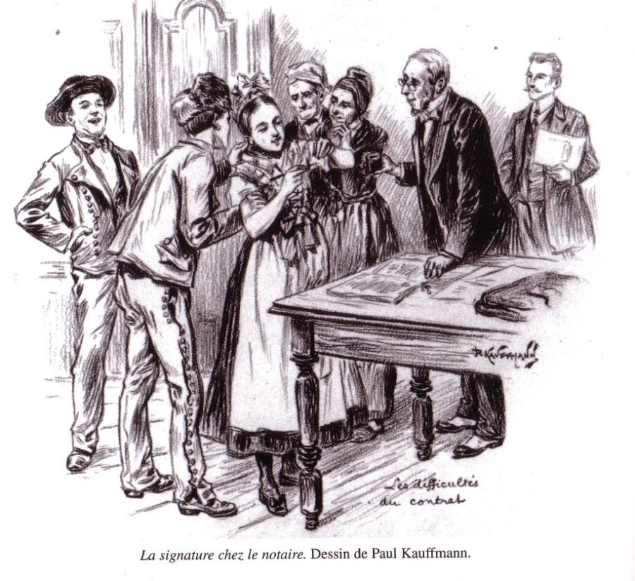son clerc, arrive à la ferme pour rédiger le contrat. Après que le contrat soit rédigé, on passe aux signatures.