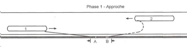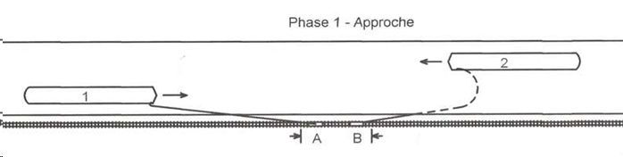 Sur le schéma 1, le tracteur B s'est arrêté le premier et le bateau 2 qu'il tractait ralenti le plus tôt. Le tirage (remorque) s'est détendu et tombe au fond du canal (cela est figuré par des pointillés).