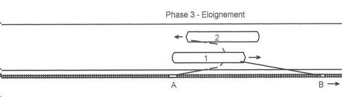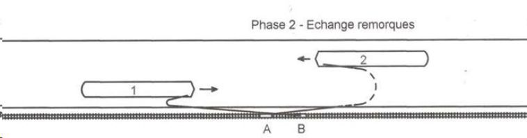 Le tracteur B remorquant le bateau 1, coté traction, se remet en route le premier. L'autre (A) attend d'être sûr que le bateau tracté par son collègue soit passé au-dessus du tirage qu'il remorque, puis démarre à son tour.