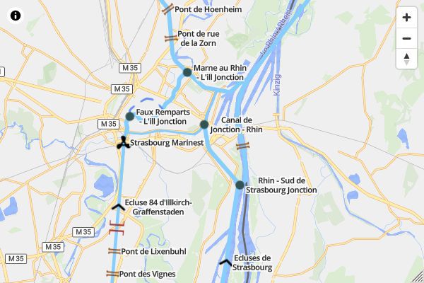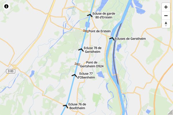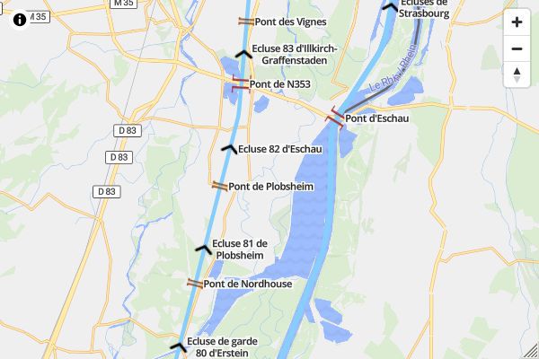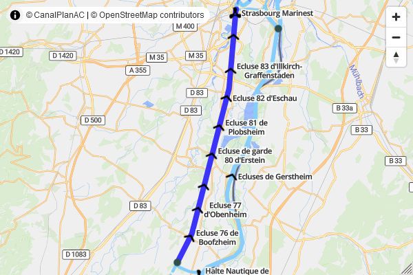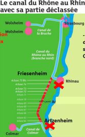 Ainsi de la branche Nord du Canal du Rhône au Rhin restent aujourd'hui essentiellement navigables le tronçon Strasbourg-Rhinau, de 33 km avec un mouillage de 2,40 m, permettant un enfoncement de 2,00 m, dont l'automatisation de huit écluses a été entreprise entre 1970 et 1980, et le tronçon Mulhouse-Ile Napoléon-Niffer de 13 km de longueur, réalisé à grand gabarit.