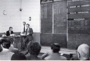 Vue intérieure de la Salle de Bourse du bureau d'Affrètement de Strasbourg. Derrière le directeur, assis au bureau, les appareils du double duplex Strasbourg-Mulhouse et Strasbourg-Sarreguemines. Au tableau mural on distingue à gauche les listes des bateaux en tour (devise, capacité, date de disponibilité), à droite sont inscrites les offres de transport, classées par région de destination (courtier, tonnage, nature de la marchandise, origine, destination du transport, montant du fret et date de mise à quai du bateau). Photo Europ Flash, prise le jour de l'inauguration du double duplex (15 janvier 1982): M. Delmas, Directeur Régional de la Navigation, pendant son allocution. Doc. PAS.