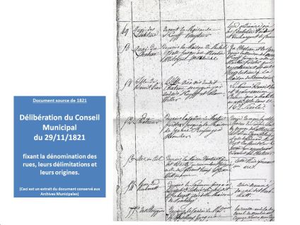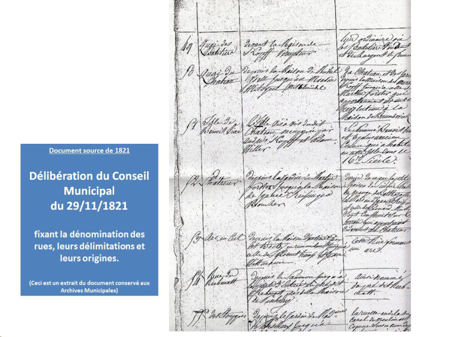 Dans une délibération du conseil municipal du 29/11/1821, au sujet de la nouvelle dénomination des rues. Les élus nous indiquent dans leur compte-rendu (en précisant l’historique des anciens noms de rues d’Erstein) que le plus ancien nom de la rue des fleurs était, dans des « temps immémoriaux », rue de la Dîme (il est également précisé dans le texte que celle-ci se trouvait à cet endroit) …