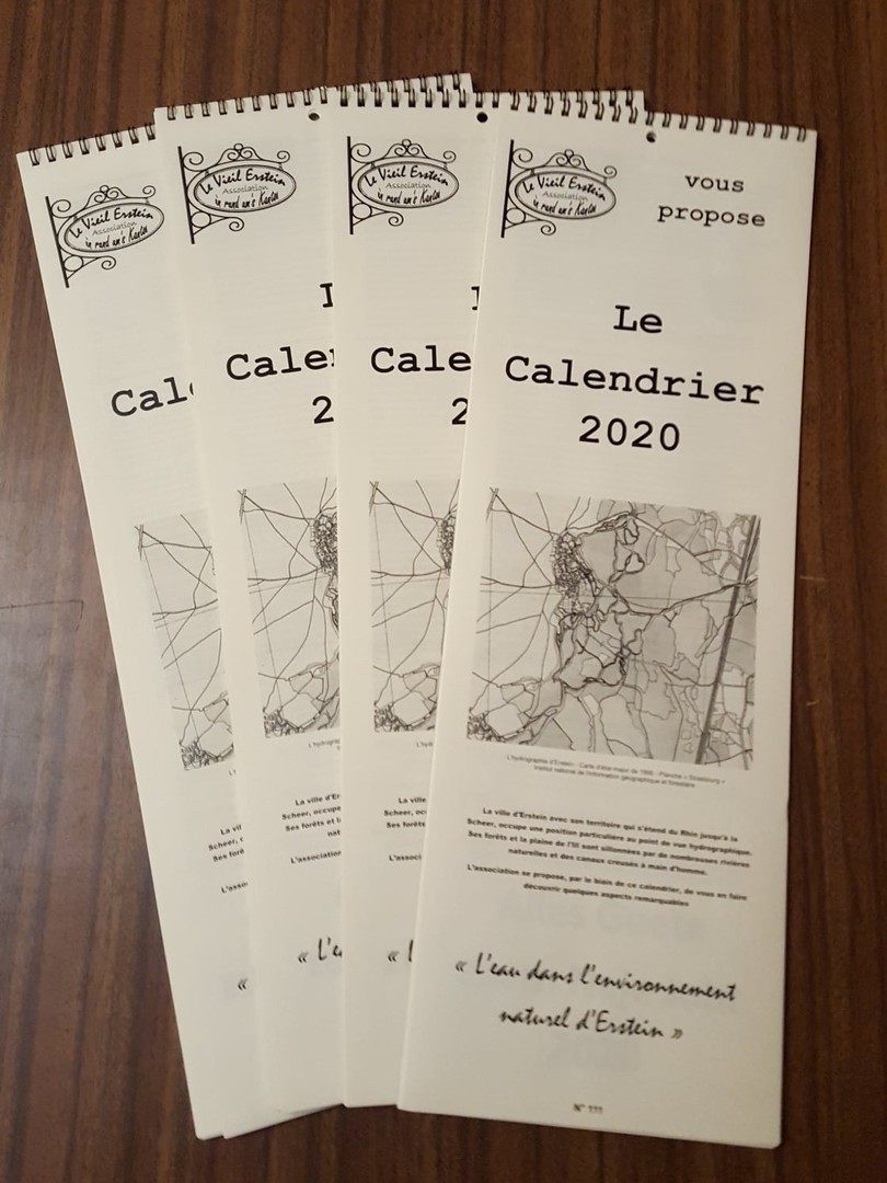 Le calendrier 2020 de l’association Le Vieil Erstein ùn rund um’s Kanton évoque l'eau dans l'environnement naturel d'Erstein.