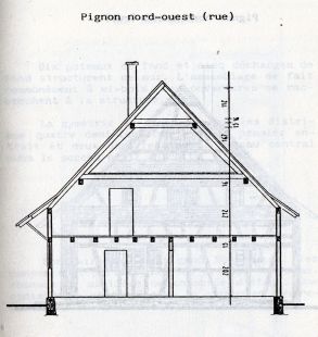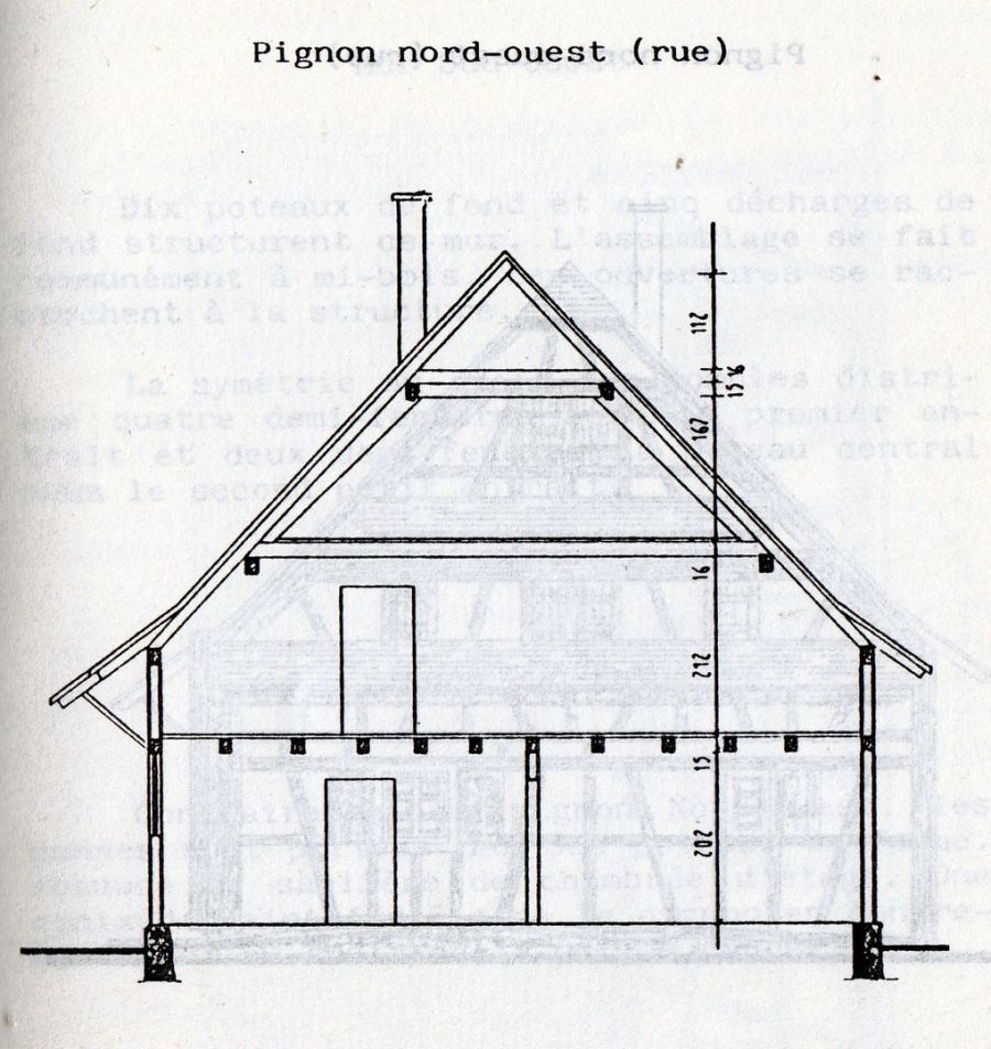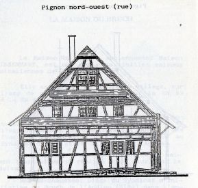La facture de ce pignon, protégé par deux auvents, est différente des autres façades. Une fenêtre et une demi-fenêtre sont placées entre l'unique cours d'entretoises et la sablée de planches. Une succession de potelets et décharges occupe la partie en surcroit (entre la sablée et l'entrait).