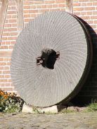 roue en pierre immobile, verticalement ou horizontalement, le grain s'écoulant entre les