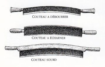 Chaque peau était donc étendue sur un chevalet de rivière et grattée soigneusement pour être débarrassée de la graisse, de la chair et de la membrane. On obtenait le tan en laissant tremper pendant quelques jours de