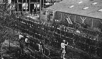 pendant six mois dans un tan épais avant d'être pendues pour égoutter, et d'être séchées,