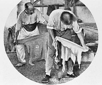 Le tannage comporte des travaux durs et sales. La peau trempée d'un gros animal est très lourde à agiter d'un bout à l'autre de la fosse.