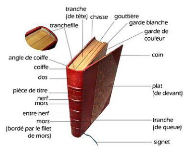 - et les demi-reliures à bande ou à coins, dont on protège également les parties les plus exposées à la main du lecteur, côté gouttière. La reliure en toile est généralement ornée d'une pièce de titre (morceau de cuir placé sur le dos du livre), sur laquelle sont apposés le nom de l'auteur et le titre du livre.