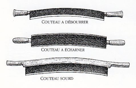 avec le couteau à dérayer à deux tranchants , couteau que l'on aiguise et dont on tourne les tranchants comme un ébéniste le fait pour ses grattoirs.