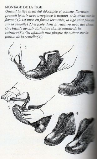 La forme est un pied en bois sur lequel le bottier cloue la première semelle, le cuir découpé suivant le contour du pied.) La forme et la première semelle étaient alors emboîtées dans la tige et cet embryon de botte était renversé, la semelle devenant désormais la surface de travail du bottier. Il fallait tendre fortement à la fois la doublure et le cuir de la tige de façon à recouvrir la semelle « aussi raide que du verre », selon les termes de Mihalis.