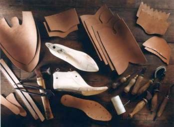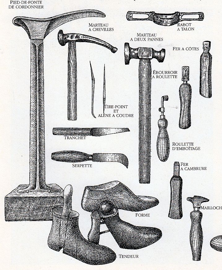 Le cordonnier utilise les outils courants de découpe et de travail du cuir (alênes, tranchets),