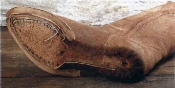 Les Indiens d'Amérique du Nord ont une façon judicieuse de faire leurs mocassins. Ils relèvent simplement un morceau de cuir vert tout autour de leur pied, le cousent à une ou plusieurs semelles et ajoutent une pièce qui couvre les orteils et le cou-de-pied. J'ai porté de ces mocassins indiens. Ils sont merveilleusement confortables et, comme le morceau de cuir enveloppant le pied est d'une seule pièce, ils sont étanches.