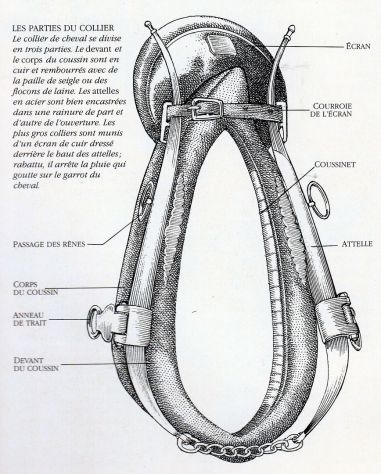 Auparavant, les chevaux portaient des bricoles ou un joug, proche de celui des bœufs, dont la sous-gorge comprimait leur trachée-artère, ou encore un collier souple qui se resserrait à l'usage. De tels systèmes diminuaient considérablement la capacité de travail du cheval et l'empêchaient de remplacer le bœuf comme principale bête de trait employée dans les fermes. Les Romains avaient même une loi interdisant qu'une paire de chevaux ne tire une charge supérieure à une demi-tonne, ce qu'un cheval de trait moderne peut aisément faire seul.