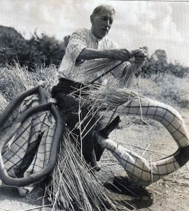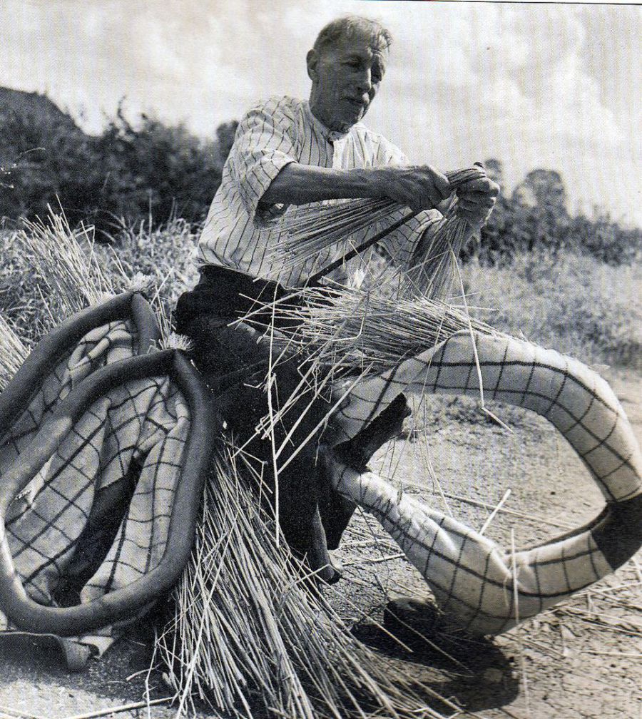 On n'en fait plus que très peu et je ne connais personne qui sache encore les confectionner. Ils sont composés d'une armature de joncs tressés dont on réunit les deux bouts. On sépare le centre des tiges avec un peigne métallique afin de pouvoir tresser d'autres joncs entre elles pour rembourrer le collier. Toute la longueur est alors étroitement serrée au moyen d'une tresse large de huit centimètres et on en réunit les deux extrémités. On coud ensuite une couverture grossière en toile d'emballage ou autre tissu similaire autour de cette armature et le collier est terminé. C'est un collier solide mais léger, utilisé pour les poulains qui ne pourraient pas en porter un plus lourd.