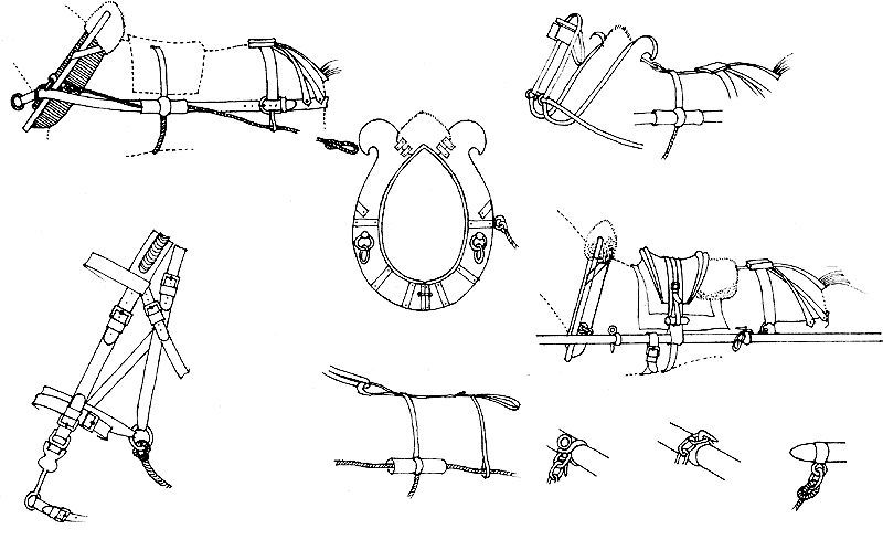 la tête de l'animal et on les réunit à l'aide de sangles et de boucles. Quant au collier fermé,