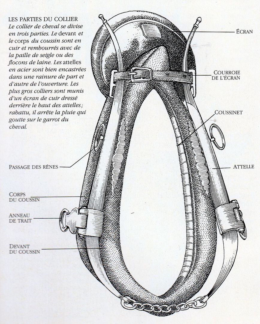 rainure de chaque côté du collier et auxquels on attache les traits et les rênes. Les attelles