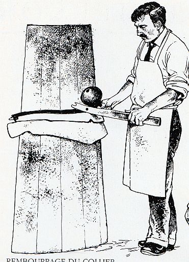 sur un modèle en bois pour le former. Le bourrelier coud alors le corps sur le rebord, le pan