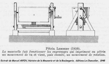 Inventée vers 1796 par Lembert, cette machine à pétrir sera primée lors d'un concours organisé par la Société d'Encouragement. Le succès commercial ne répondra pas aux attentes de l'inventeur, car il s'agissait d'une simple mélangeuse peu efficace.