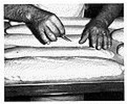 Vaury auteur du Guide du boulanger, décrit très précisément la coupe des "pains de table ou flûtes crevées, très serrées à la tourne, 8 pouces de long, pointues des bouts, posées sur couche, moulure dessous, séparées par un pli de couche. On les met au four les dernières, on les mouille légèrement avec une brosse puis on les coupe au dessus avec un canif, très légèrement, en inclinant la main, alors on les lève avec les mains pour les poser sur la pelle et on les enfourne. C'est toujours à bouche de four qu'elles doivent être mises, et on ne doit jamais ouvrir le four avant qu'elles ne soient bien jetées, ce qui