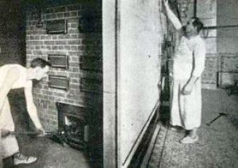 Dans la partie droite de la photo l'on remarque au fond la façade du four; à gauche un ouvrier qui charge le foyer (houille) qui chauffe les tubes Perkins ...